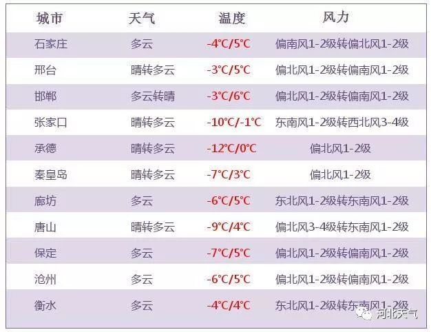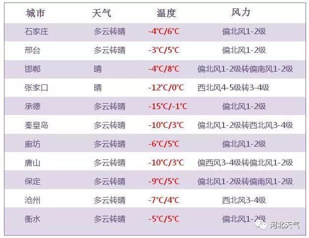 預計明天(17日),河北大部地區最低氣溫變幅不大,北部地區設區市(張家口、承德、唐山、秦皇島)最低氣溫為-13℃至-7℃,中南部地區各設區市為-7℃至-3℃;