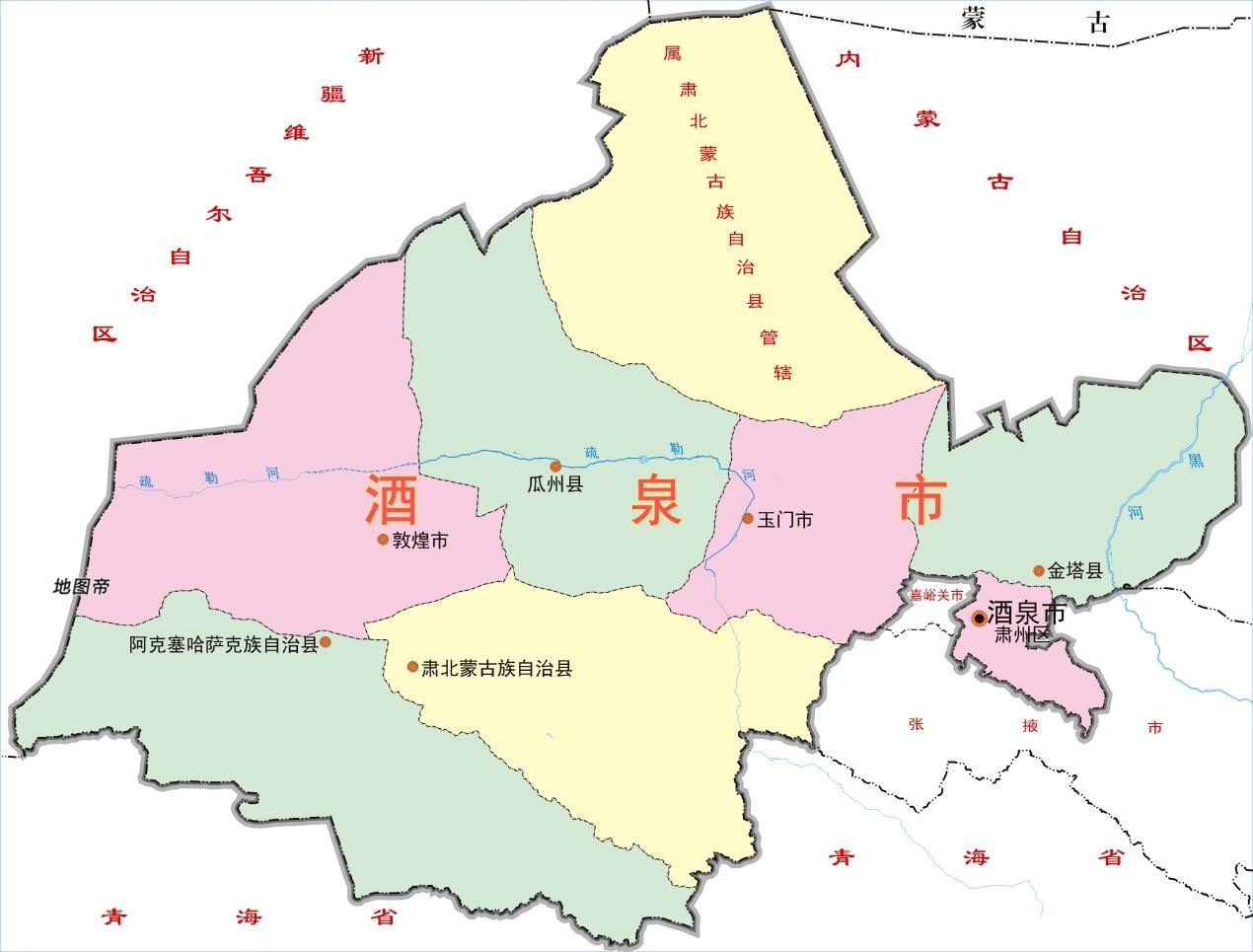 酒泉市和很多地區接壤,按順時針方向來看,東邊是甘肅張掖市,南邊是青海省,西邊是新疆維吾爾自治區,北邊是內蒙古阿拉善盟,另外北邊還有一小部分和蒙古國接壤。