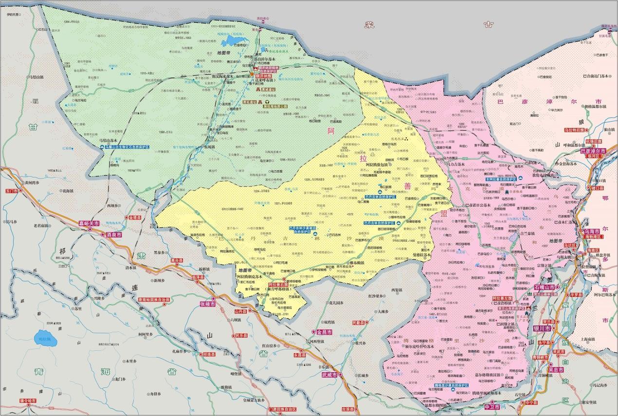 阿拉善盟沿西北到東南方向分為三個旗:額濟納旗、阿拉善右旗、阿拉善左旗。在額濟納旗、阿拉善右旗、甘肅酒泉金塔縣交界的地方,有個凹陷深入額濟納旗。