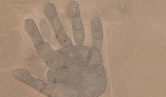 我們看衛星地圖,挪到內蒙古二連浩特市,你會驚奇的發現,地圖上有一個清晰的巨大的手掌,掌紋清晰可見,有“橫紋”,似“斷掌”。