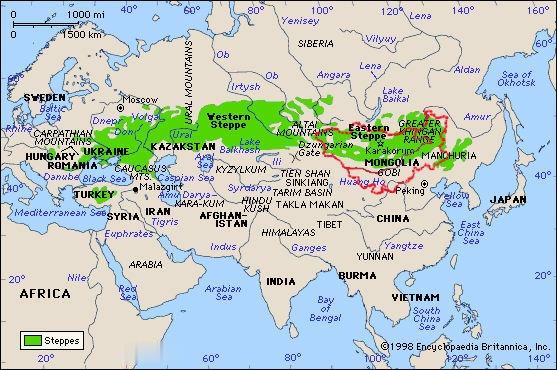 (世界上最寬廣的草原區,綿延8000多公里的歐亞草原區。紅色線圍繞部分為蒙古高原)