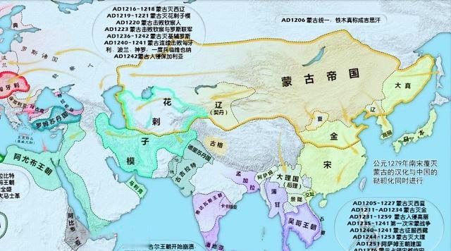 1206年,鐵木真年在斡難河河源建立大蒙古國,尊汗號為成吉思汗 ,蒙古人開始擴張;至1259年蒙哥汗去世時,大蒙古國已占據包括漠北、華北、東北、西藏、西域、中亞、西亞、東歐等在內的遼闊地域。