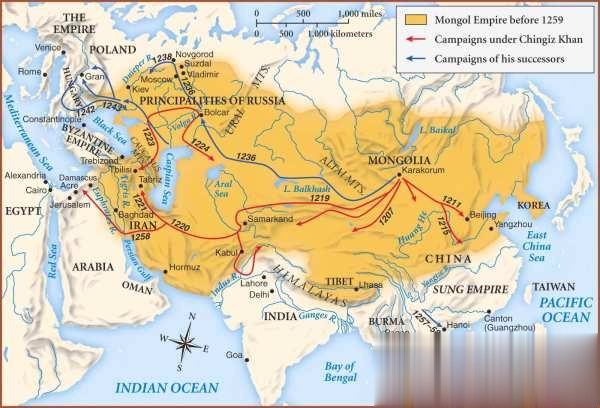 蒙古人,東征西討,終于到了古代國家所能控制的最大地理極限,而且由于通訊,交通,組織,文化,地理等各方面不可超越時代的原因,蒙古帝國在蒙哥汗死亡之后,迅速分裂為四大汗國。