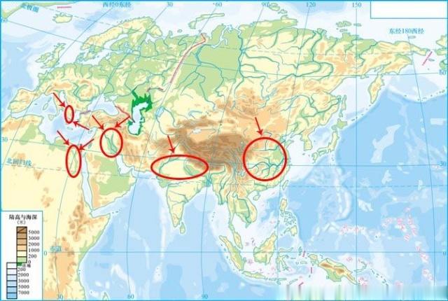 (亞歐大陸地形圖,紅圈是幾大文明發源地,箭頭是可能遭受的攻擊方向。)