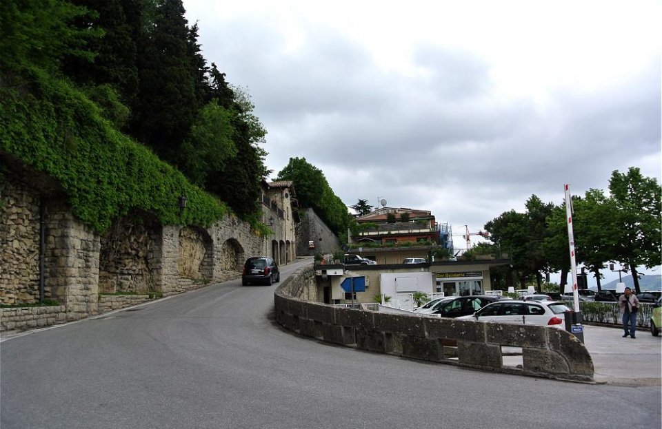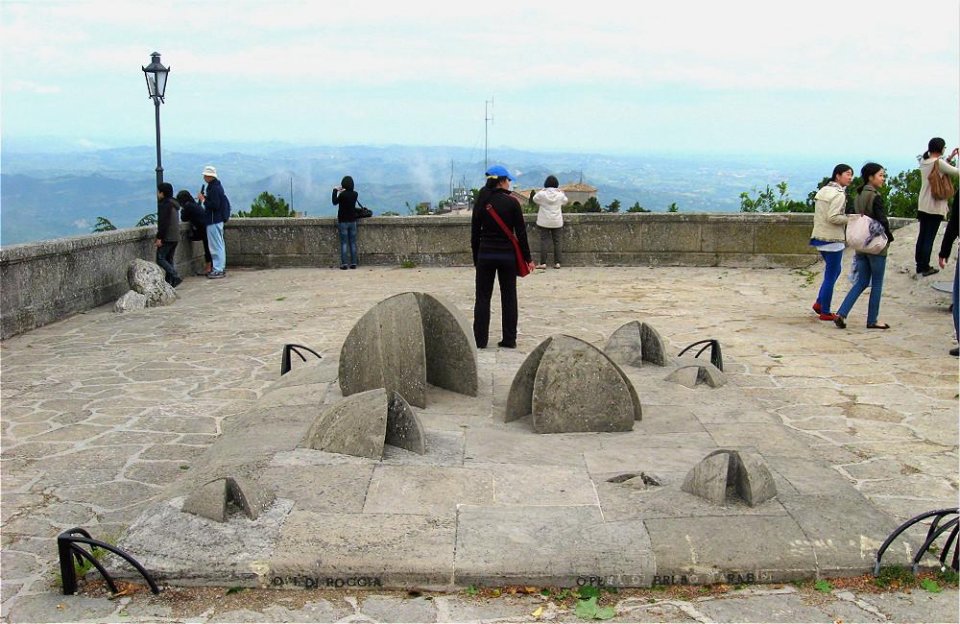 圣馬力諾就是位于一塊高巖上,四周由城墻環(huán)繞,巖頂盤踞著三座堅固的堡壘,也可以說是要塞。分別是一號羅卡(Rocc,又稱瓜伊塔/ Guaita)、二號切斯塔(Cesta,又稱弗拉塔/Fratta)和三號堡壘蒙塔萊(Montale),外加蒂塔諾山下的一片丘陵地組成的。平臺立著的石頭模型分別代表三座要塞。