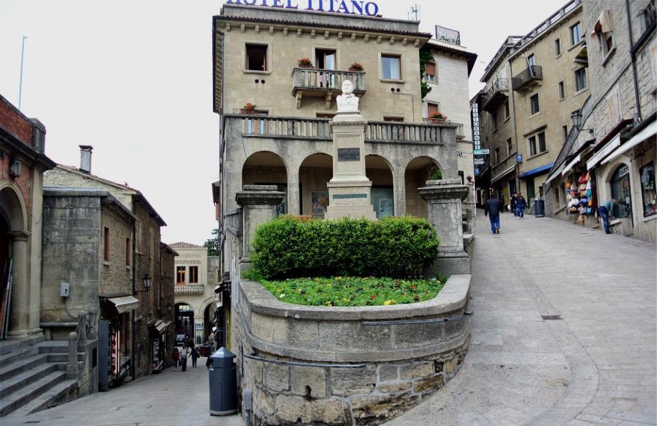 廣場的自由女神像,后面墻上黃色的標記就是三座要塞,圣馬力諾國的象征。