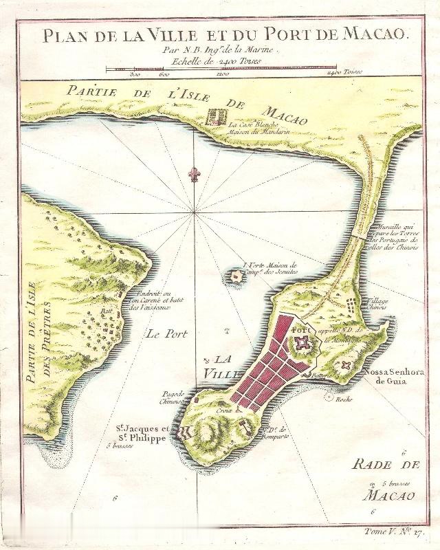 澳門原本只是廣東香山縣一個小島,在明朝時期出租給葡萄人晾曬貨物之用。清朝時期前期和中期依然如此,葡萄牙人每年都要定期繳納租金,如果葡萄牙人建設房屋必須要經過香山縣同意才可以建設。圖為1767年澳門地圖。