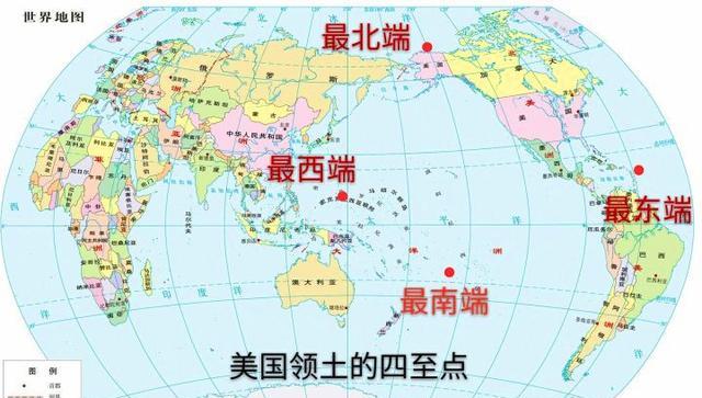 美國(guó)領(lǐng)土最北端: 阿拉斯加州巴羅角、美國(guó)領(lǐng)土最南端: 美屬薩摩亞步伐角、美國(guó)領(lǐng)土最西端: 關(guān)島奧鹿角、美國(guó)領(lǐng)土最東端: 美屬維爾京群島彼夫島。