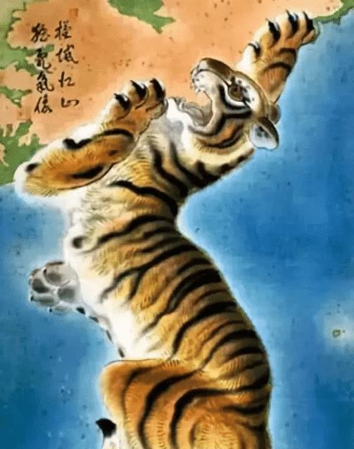 而且日本不僅對于我們的國家地圖有看法,對朝鮮的地圖一樣有看法,當年他們想侵略朝鮮半島的時候,就公開表示過,朝鮮半島的地圖看上去就像是一只兔子,一只柔軟的兔子。不過這一點人朝鮮人可不認同,他們覺得他們的地圖看上去是一只老虎,一只兇惡的大老虎。韓國的一位畫家還把這只老虎的形象給畫了出來,除此之外,還有人覺得朝鮮半島的地圖看上去像是一只木槿花,木槿花是朝鮮的國花,這樣比喻倒也挺恰當的。