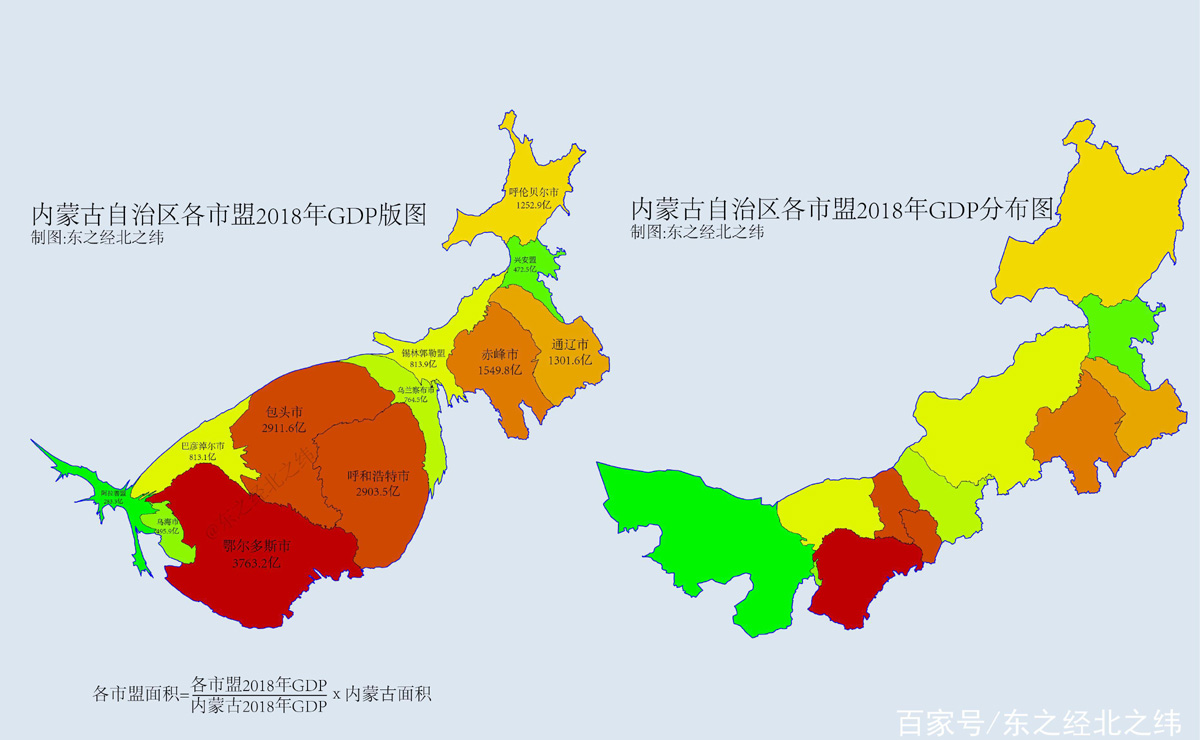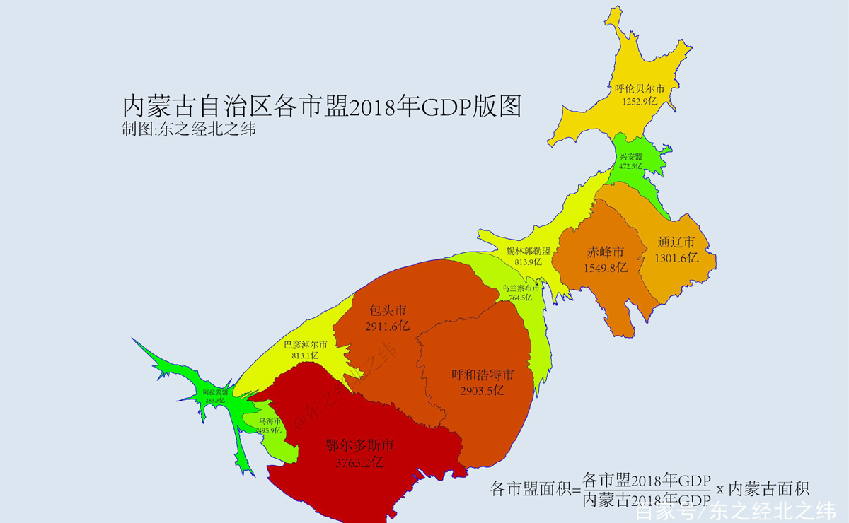 內蒙古各市盟2018年GDP版圖(變形地圖)中各市面積=(各市2018年GDP/內蒙古2018年GDP)*內蒙古面積,即2018年GDP總量越大,則該市在“內蒙古各市盟變形地圖”中的面積也就越大。