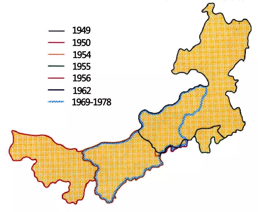 地域狹長的內蒙古自治區版圖首次定型于1956年。在此之前,這一區域經歷了一系列分分合合和區劃調整。