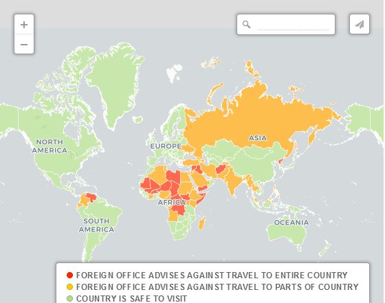 哪里更安全這張地圖顯示了英國外交部認為對游客安全的國家(綠色部分)和不安全的國家(紅色部分)。建議游客勿往不安全國家旅游。