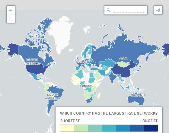 鐵路里程這張地圖根據鐵路顯示了世界各國鐵路分布。深藍色的網絡覆蓋最廣,淺色的網絡最小。美國、中國、俄羅斯、印度和加拿大位列前五。有些國家根本沒有鐵路,通常是由于環境惡劣、多山或森林茂密。這些國家包括冰島、格陵蘭、也門、阿曼、不丹、利比亞和巴布亞新幾內亞。