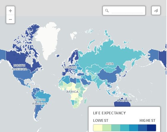 預期壽命這是一張按預期壽命展示世界的地圖。非洲平均預期壽命低于60歲的大洲,總共有28個國家。其中塞拉利昂的預期壽命最低,低至46歲。根據世界衛生組織的數據,日本是世界上居民壽命最長的國家,平均壽命為84歲。美國預期壽命為79歲,中國預期壽命為75歲,印度則為66歲。