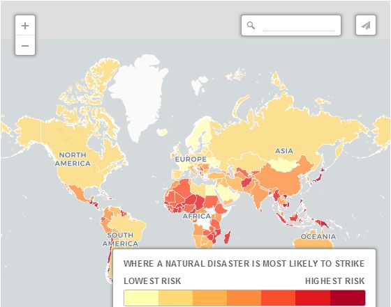 自然災害根據聯合國環境與人類安全大學(UNU-EHS)編制的《2015年世界風險報告》,這張地圖顯示了哪些國家最容易受到地震、風暴、洪水或干旱的威脅。歐洲和美國加拿大因其好的地理條件基本上沒有什么自然災害,非洲和環太平洋國家受自然災害影響最多。