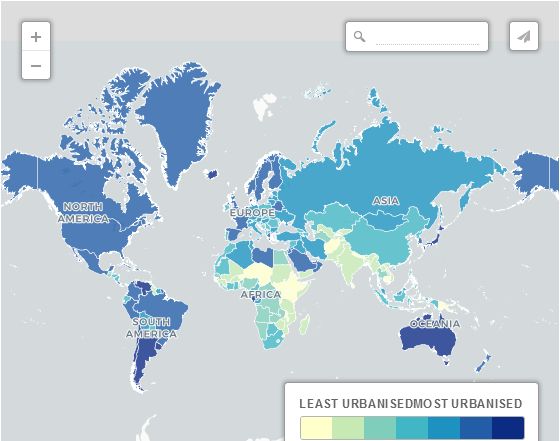 城鎮化進程這張地圖按城市人口占總人口的百分比顯示世界。深藍色區域的國家或地區的城市化人口最多,淺色區域國家或地區城市化人口最少。世界上目前7個地方的人口100%生活在城市地區:香港、新加坡、百慕大、澳門、開曼群島、新馬滕島和摩納哥。其他高度城市化的國家包括卡塔爾、科威特、比利時、馬耳他和烏拉圭。城市化程度最低的人有:特林達和多巴哥、布隆迪、巴布亞新幾內亞、烏干達、馬拉維、尼泊