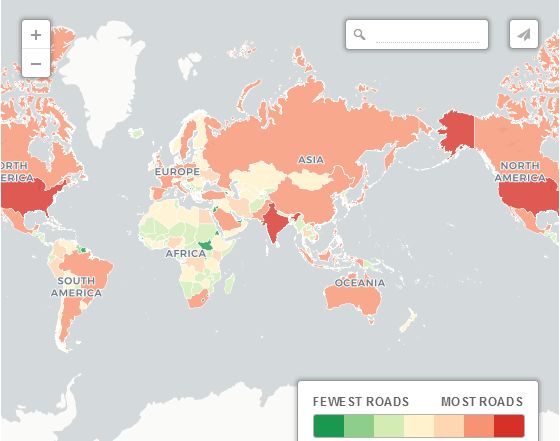 公路網密度這張地圖顯示了世界各地公路網絡的總長度。美國名列榜首,有600萬公里的公路。排名前五的其他國家:印度、中國、巴西和俄羅斯。最少公路網的則是南太平洋的圖瓦盧,只有8公里。