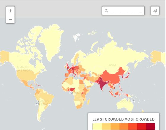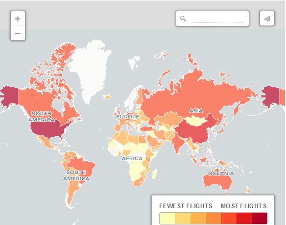 航班密度根據世界銀行2014年發布的數據,這張地圖顯示了哪些國家最常乘坐飛機的國家。美國的地大財多,排名第一。排名第二的是中國。前十其余為:加拿大,巴西,日本,德國,俄羅斯,土耳其和印度。全球乍得航班最少,一年只有75次,平均5天才有一趟飛機在乍得機場起降。