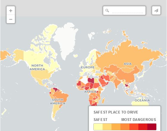 交通事故死亡人數圖上反映的是每年每10萬居民的道路死亡人數。死亡人數最多的駕車地區有利比亞(40.5人)和伊拉克(31.5人)、泰國(38.1人)和南非(31.9人)。厄瓜多爾、越南、巴西、巴拉圭、肯尼亞和老撾也有相對危險的道路。最安全的駕車地點包括馬爾代夫(1.9人死亡,因其缺乏道路是主因)、挪威(2.9人死亡)、丹麥(3人死亡)、瑞典(3人死亡)和瑞士(3.4人死亡)