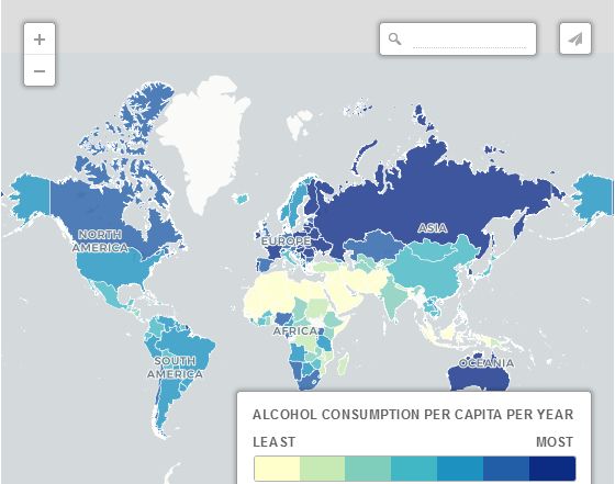 酒精消費這張地圖反映了人均酒精消費量。白俄羅斯是世界上酒精消費量最大的國家,一個成年人平均每年消費17.5升純酒精,相當于179瓶葡萄酒或1750杯伏特加。緊隨其后的是摩爾多瓦、立陶宛、俄羅斯、羅馬尼亞和烏克蘭。中國人均年消費6.7升純酒精,比歐美絕大多數國家少得多。