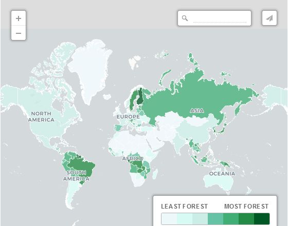 森林覆蓋率根據世界銀行的公開數據,上面的地圖顯示了森林面積百分比最高的國家。不出所料,南美洲、加勒比海、非洲、東南亞和南太平洋的熱帶地區占據了主導地位。樹木最少的國家呢?根據世界銀行的定義,有4個國家根本沒有森林——圣馬力諾、卡塔爾、格陵蘭和阿曼。世界上還有12個國家的森林不到1%。