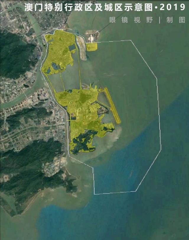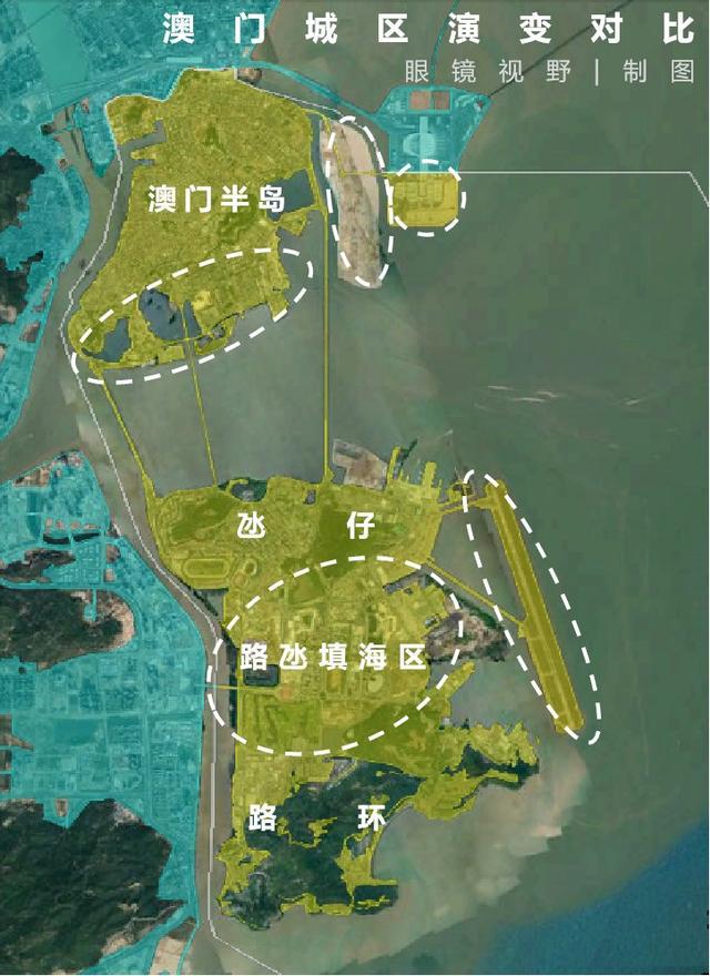 上圖白色虛線橢圓區(qū)域?yàn)榘拈T的幾個(gè)填海造陸大致區(qū)域,其面積幾乎占了澳門陸地面積的一半。
