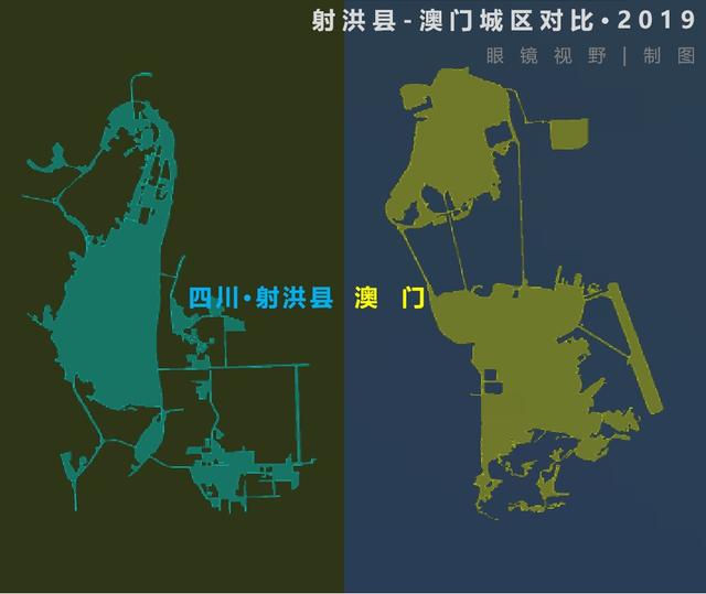 再又選取一個(gè)城區(qū)形態(tài)與澳門相似的縣城——四川省射洪縣,從城區(qū)格局上對(duì)比,澳門與這個(gè)普通的小縣城幾乎等大。