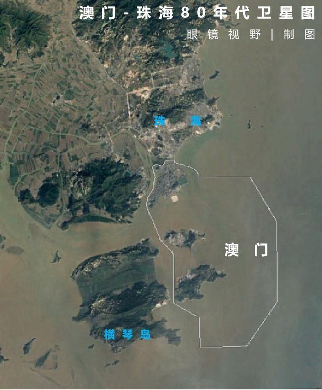 澳門填海造城的同時(shí),珠海也以更快的速度填海,下圖為80年代的珠海與深圳,那時(shí)的橫琴島與澳門路環(huán)、氹仔之間還相隔這大片海域。