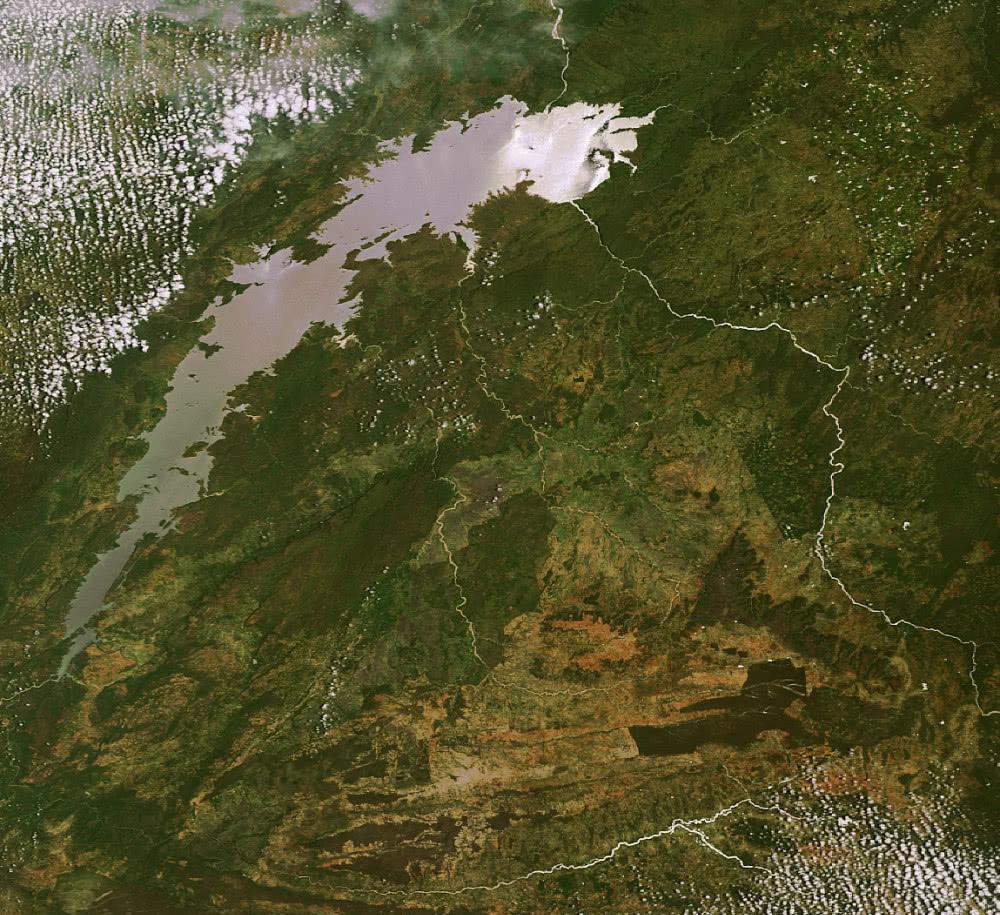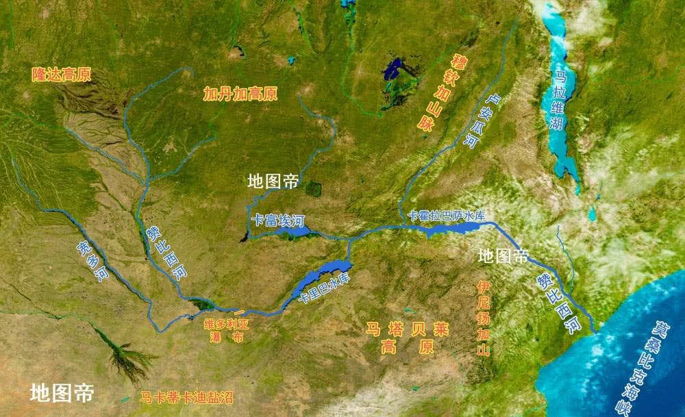 卡里巴水庫位于贊比亞首都東南約300公里,是贊比亞和津巴布韋兩國分界線。從地圖上看,贊比西河比水庫窄得多,可見水庫之大。