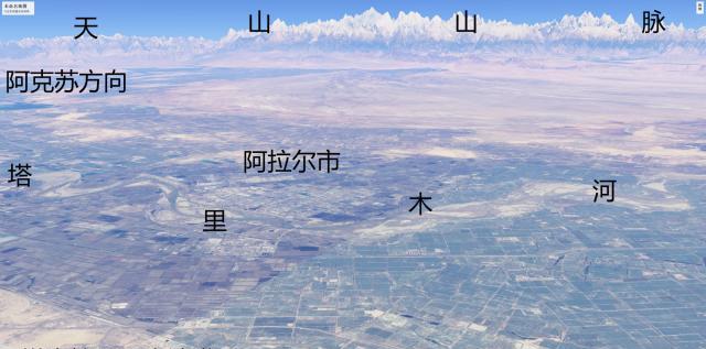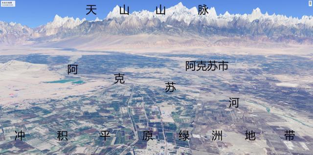 圖中位于皚皚天山雪峰腳下的城市就是阿克蘇市,它是阿克蘇地區的駐地城市。發源于天山上的阿克蘇河流經該地區,為城市和周圍的土地提供了寶貴的水源,也使得這一地區沒有被流動的塔克拉瑪干大沙漠所覆蓋。晝夜溫差大,導致了阿克蘇地區是新疆水果的重要的產地,尤其是阿克蘇蘋果(大家應該都吃過吧,很甜很甜)。