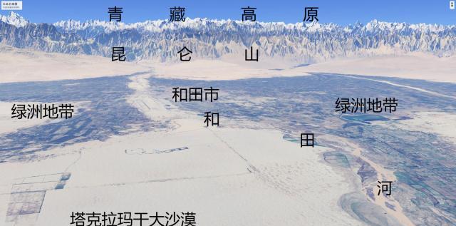 圖中位于昆侖山腳下,塔里木盆地南緣的城市就是和田市,發源于昆侖山的和田河從其附近流過,在沙漠戈壁當中造就了面積巨大的綠洲。所以在古代,和田是絲綢之路南線最為重要的補給點。和田河在穿越了茫茫的塔克拉瑪干大沙漠后在盆地的北部(阿拉爾市附近)注入了我國最大的內流河-塔里木河。