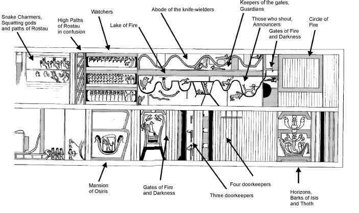 書中描述了兩條穿越危險景觀的鋸齒形路徑,一條是水路,一條是陸路。那些企圖進入到奧西里斯王國的挑戰者將面臨惡魔的挑戰。蜿蜒的小路很危險,有時甚至無路可走。它們被火湖隔開,沿途,必須穿越熾熱的“火場”,無數的守衛和揮舞著大刀的惡魔用高高的石頭和火擋住去路。