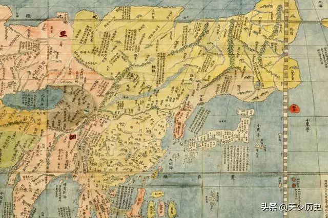 從圖中可以看出,明朝地域用黃色標識,幅員廣闊,南到南海,北到北冰洋都是明朝的領土。非明朝領土則用不同顏色標示,比如朝鮮半島用紅色加以區分。明朝時期已經知道長江黃河的具體流向,畫出長城的走向。管東海叫大明海,南海叫萬里長沙。