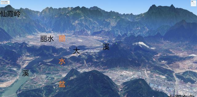 圖中位于群山盆地(麗水盆地)之中的城市就是浙江最南部的地級市-麗水市。和圖中的地形類似,麗水境內山多地少。據統計,整個麗水市較大規模的盆地平原就只有麗水盆地和松古盆地,剩余都是山地丘陵山地占到了全市面積的88%以上,浙江省的第一高峰(黃茅尖),第二高峰(百山祖)都位于麗水市境內。