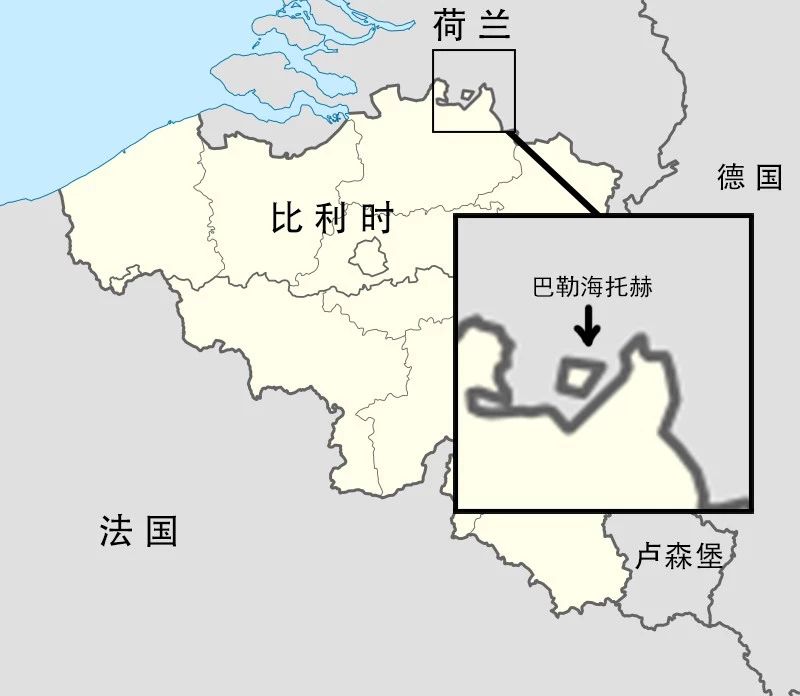 這個地區(qū)總名稱為巴勒,位置在荷蘭境內(nèi),包括兩個城鎮(zhèn),一個叫巴勒納紹(Baarle-Nassau),是荷蘭的市鎮(zhèn),一個叫巴勒海托赫(Baarle-Hertog)自治市,是比利時的飛地。