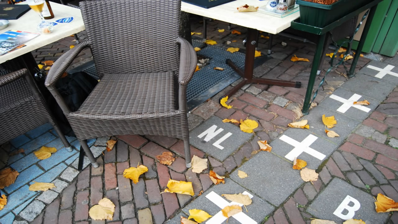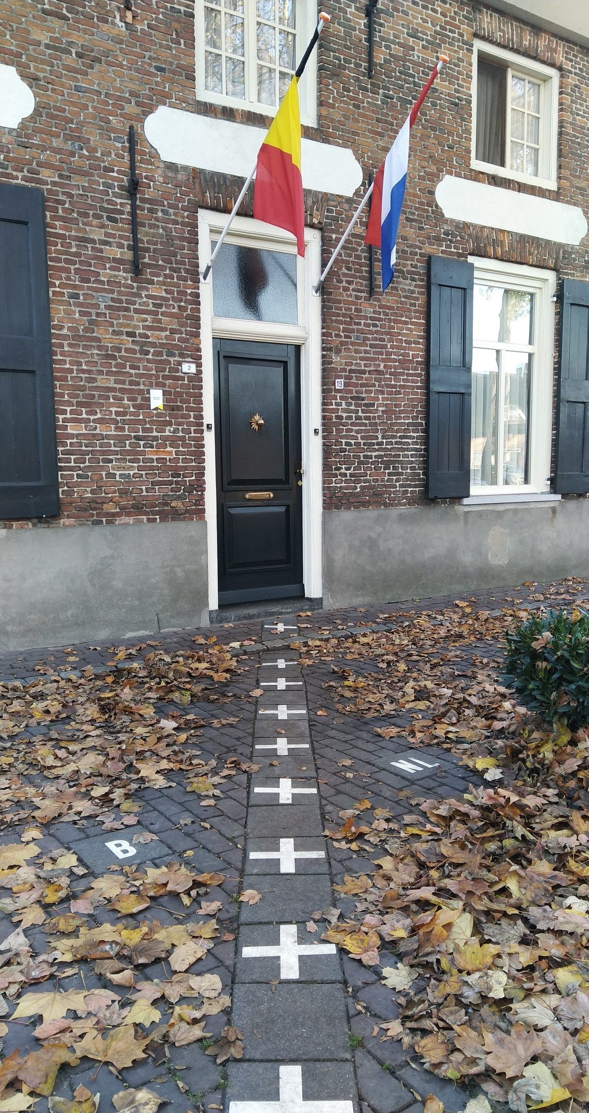 有一張照片中,大門口一側(cè)掛著比利時國旗,一側(cè)掛著荷蘭國旗;另一張照片中,一家餐館的地面被白色十字符號分成了兩個部分,一邊寫著B,表示比利時地界,一邊寫著NL,表示荷蘭地界。