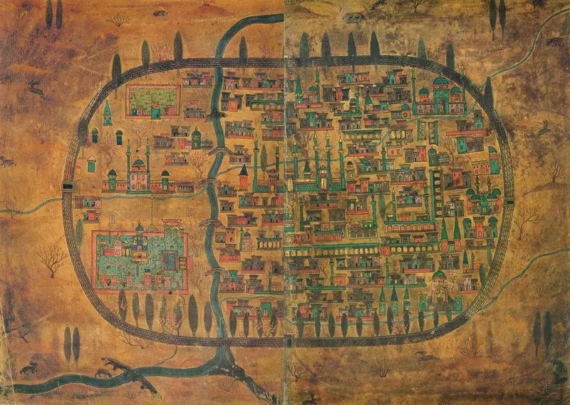 此外,位于阿拉伯河下游的巴士拉城,也被山水圖的作者所標注。因為這里是西亞國際貿(mào)易的東方出海口,也是性堪比巴格達的重要區(qū)域中心。從這里下海的船只,很快就能抵達鄭和曾造訪過的霍爾木茲島。這條航線向東蔓延,就以明朝治下的廣州城為終點。若非朱家天子的海禁政策,則可以繼續(xù)輻射到福建的泉州、浙江的寧波、江蘇的揚州,乃至今日的青島。