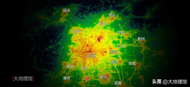 根據(jù)NASA公布數(shù)據(jù),還可以對(duì)其密度進(jìn)行分層,形成彩色地圖——紅色越重,代表那里的亮度越高,往往也意味著人口活動(dòng)熱度也越大,光斑面積一定程度上可以反映城市面積大小。圖為珠三角地區(qū)的燈光地圖——從另一個(gè)角度,天文學(xué)和環(huán)保人士將這種景觀(guān)稱(chēng)為“光污染”。