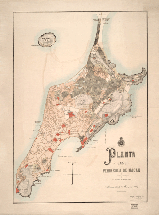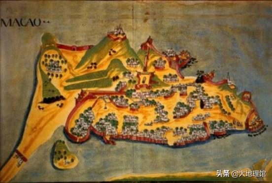 1639年繪制的澳門半島地圖,方向為左北、右南,左下角為青洲島
