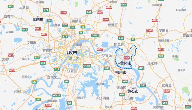 下面就是武漢市區(qū)與黃岡市黃州區(qū)的位置關(guān)系。
