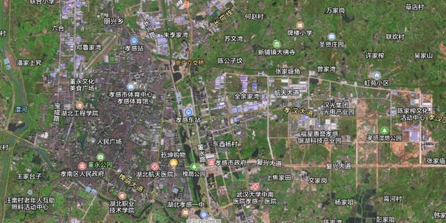 下面是孝感市的市區地圖,可以看出孝感市的東部有一片新區,這也就是接近武漢市區的地方。