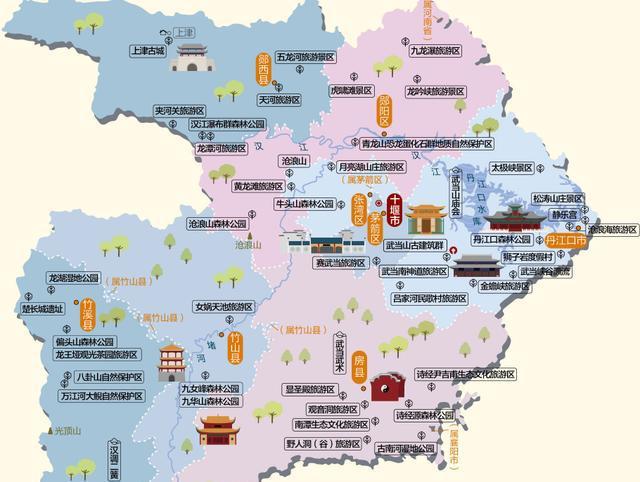十堰市轄茅箭區、張灣區、鄖陽區及丹江口市、鄖西縣、竹山縣、竹溪縣、房縣。