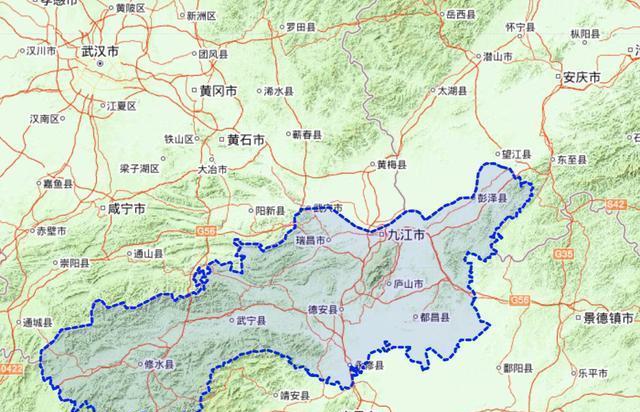 下面是江西省九江市的地圖,九江市的市區距離最近的地方也并不是江西省的某個地方,而就是湖北省的黃岡市的黃梅縣。