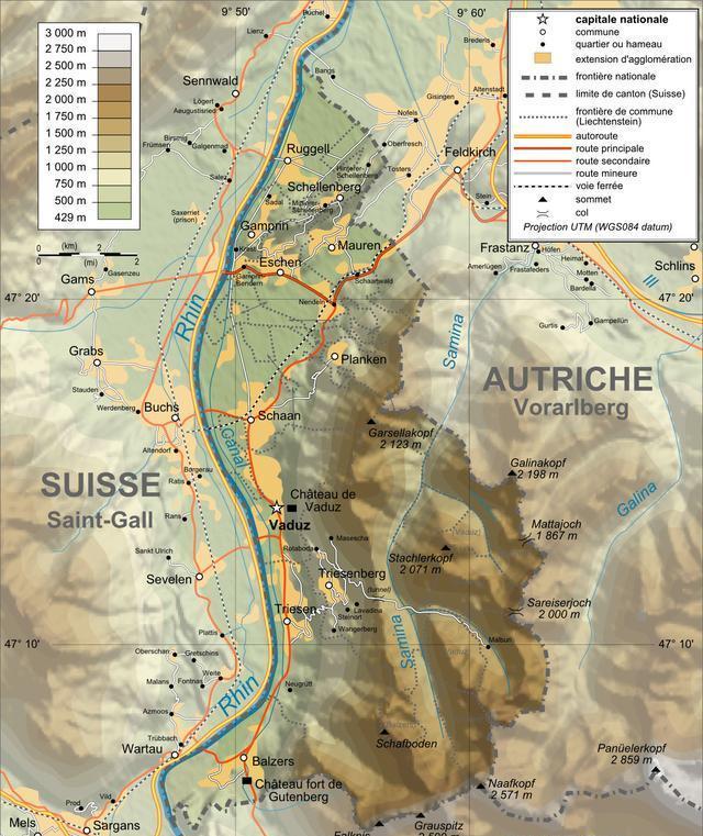 從上面地圖中可以看出,列支敦士登的平原主要集中在西側(cè),而山區(qū)主要集中在東側(cè)。因此城鎮(zhèn)的中心也是在西側(cè)。