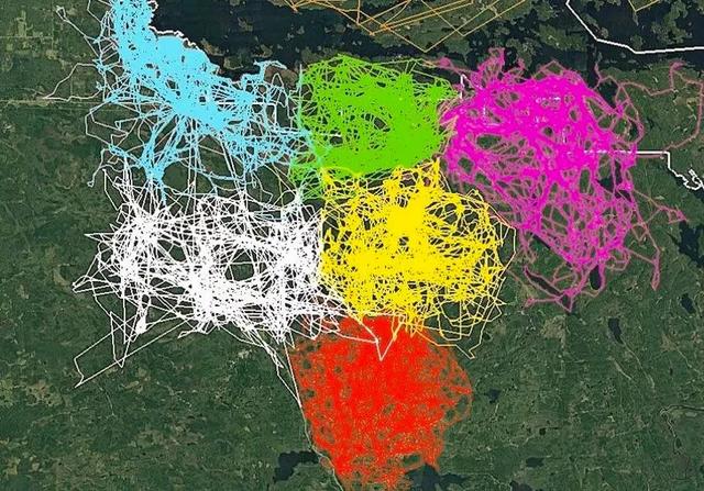 某個國家公園給森林里的狼裝上GPS定位系統(tǒng)后,所得到的的軌跡地圖,我們可以看見它們都在小心的避開彼此的領(lǐng)地。