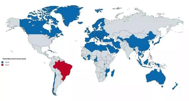 如果把藍(lán)色區(qū)域的一年內(nèi)發(fā)生的兇殺案件算在一起,數(shù)量仍然會少于紅色的巴西