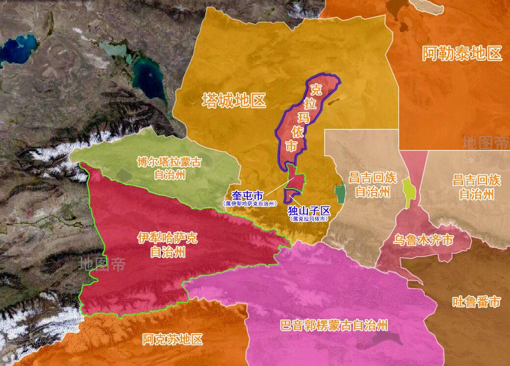 其實在建國初期,這里是不存在這樣的飛地的。克拉瑪依、獨山子和奎屯當(dāng)時都是歸塔城專區(qū)管轄的。出現(xiàn)飛地的情況還是在克拉瑪依獨立成市以后。
