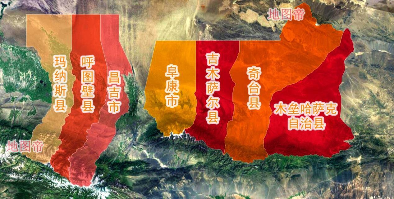 昌吉州有如此大的面積,和它接壤的地區非常多。按順時針方向看,東邊有哈密,南邊有吐魯番、烏魯木齊和巴音郭楞蒙古自治州,西邊和北邊有塔城地區、阿勒泰地區,東北方向和蒙古國接壤。