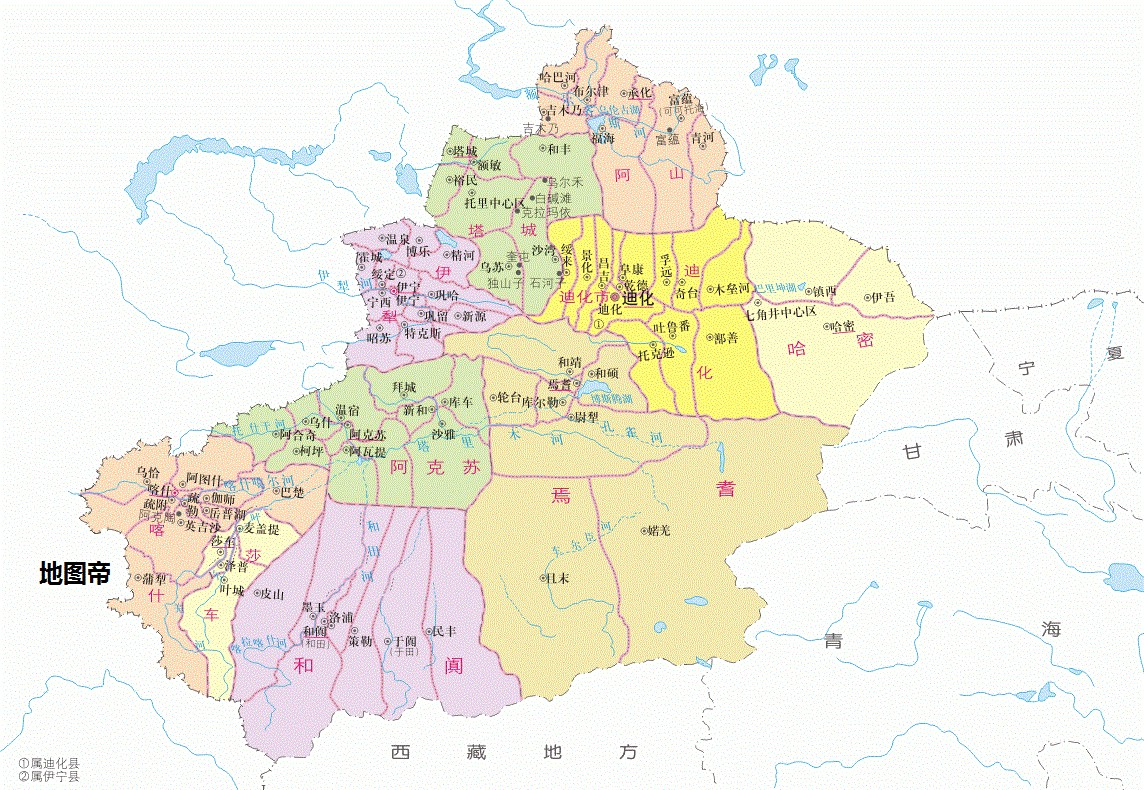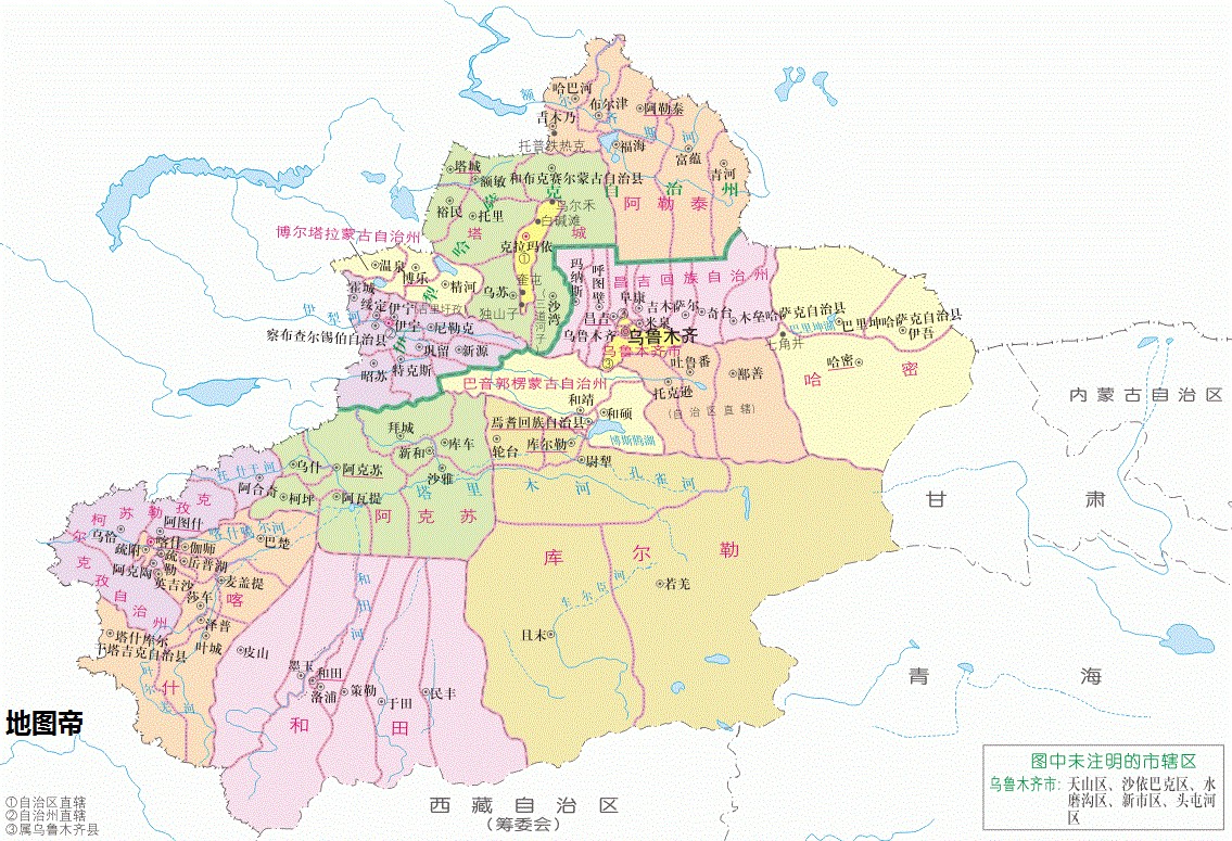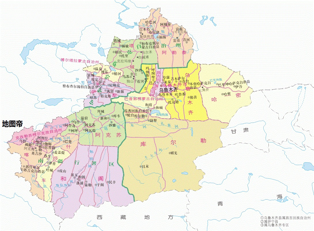 新疆各區的區劃因為有生產建設兵團的存在,一般都比較復雜,地圖上看到的區劃和實際的有很大區別。新疆建設兵團的團場不規則地分布于各地,形成錯綜復雜的局面。