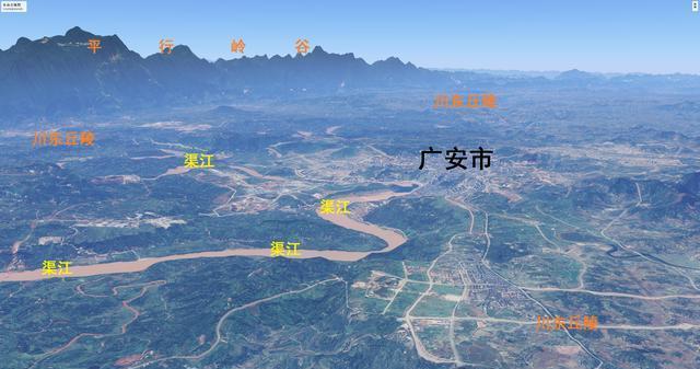 不熟悉四川地理的外省人經常把廣安和廣元混淆,或者干脆就沒聽說過這個名字。但是只要提到那個在我國的南海邊畫圈的老人-鄧爺爺,大家一定都認識,而廣安就是鄧爺爺的家鄉。廣安位于四川盆地的東部,從圖上看,渠江在其城市外圍“蜿蜒”流過(是嘉陵江的一條支流),遠處是著名的平行谷嶺(好幾條山脈呈現出南北走向的平行分布)。別看廣安城市不大,其整個行政區劃6000多平方公里的土地上有460多萬人,人口密度也是很大的。